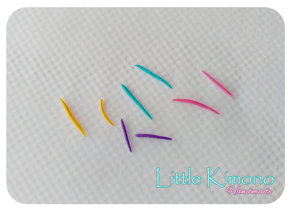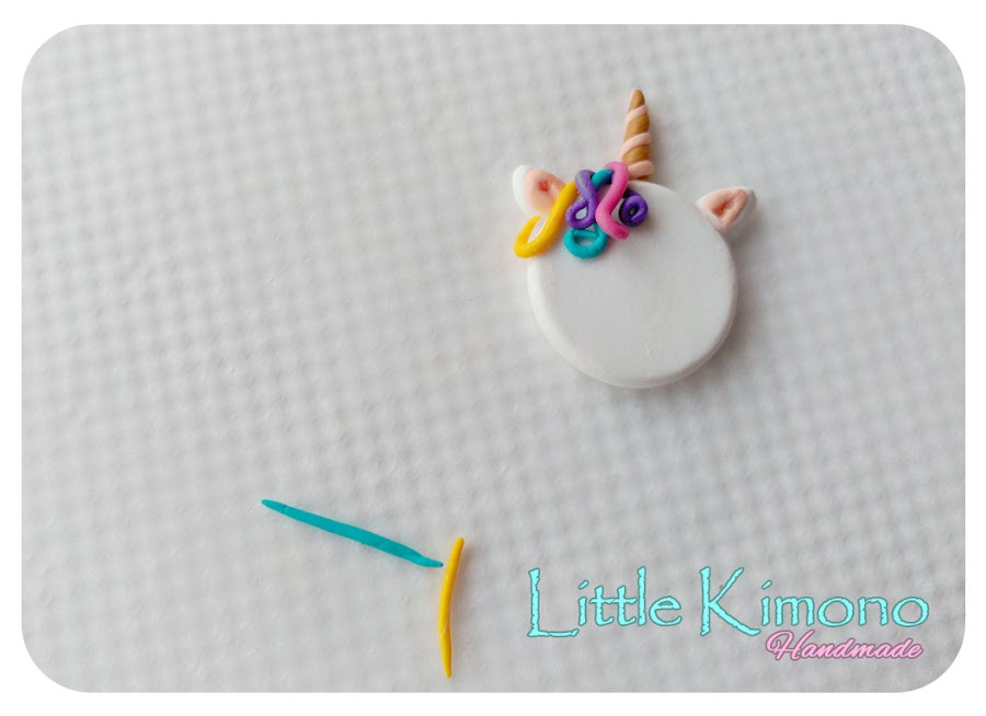 5. Por último haremos "fideos" de varios colores que serán los mechones de nuestro unicornio y los vamos colocando con cuidado en la parte superior de la figura.