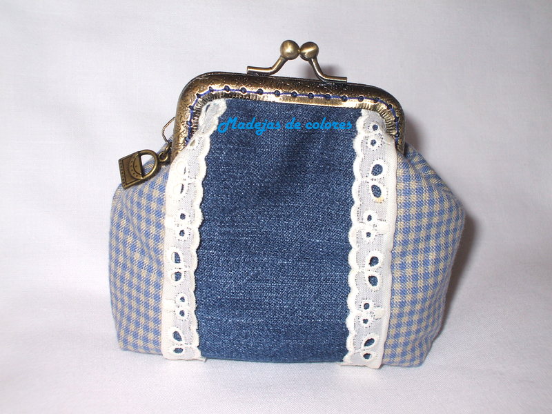 Para la madre quise hacer un modelo algo más clásico, pero con un toque actual, al incorporar tela vaquera fina, combinada con un Vichy rústico azul. Como detalle, una tira bordada en la unión de las telas y un charms en forma de bolsito.