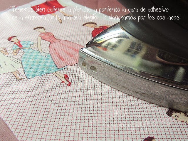 Recordad que este tipo de entretela ( sin ser una experta creo que también se le llama fiselina), tiene una cara mate sin adhesivo y una cara brillante con el adhesivo...