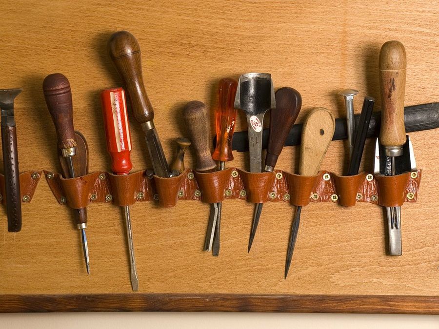 El panel de herramientas es un accesorio importante para conservar los instrumentos bien afilados. Una tira de cuero atornillada a la madera hará de inmejorable soporte.