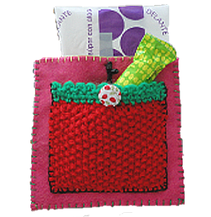 Llevar en el bolso esas cositas que las mujeres necesitamos todos los meses, puede hacerse de una forma muy coqueta. Este lindo complemento de fieltro hecho totalmente a mano, permite guardar dos compresas, y dos o tres tampones en un bolsillo exterior tejido a punto de arroz.