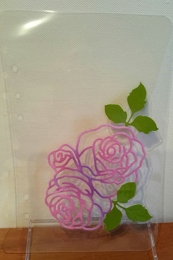 La de la rosa, es un troquel pintado con tintas jugando con varios tonos y las hojas hechas con cartulina pegadas lo justo para que no se movieran