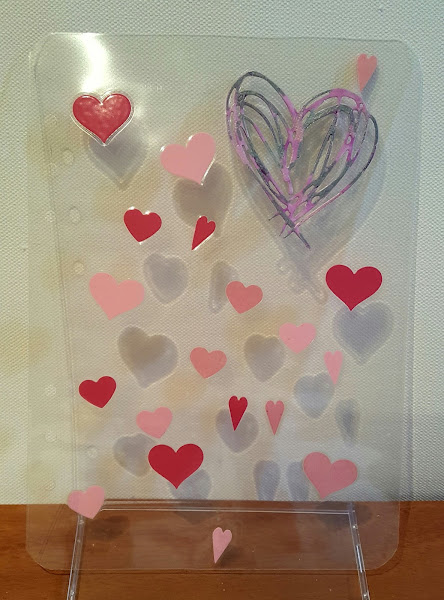 La de corazones, son hechos con troqueladoras de varias medidas y formas hechas con cartulina, el corazón es un troquel grande embosado, quedo bien a pesar del calor de la plastificadora!