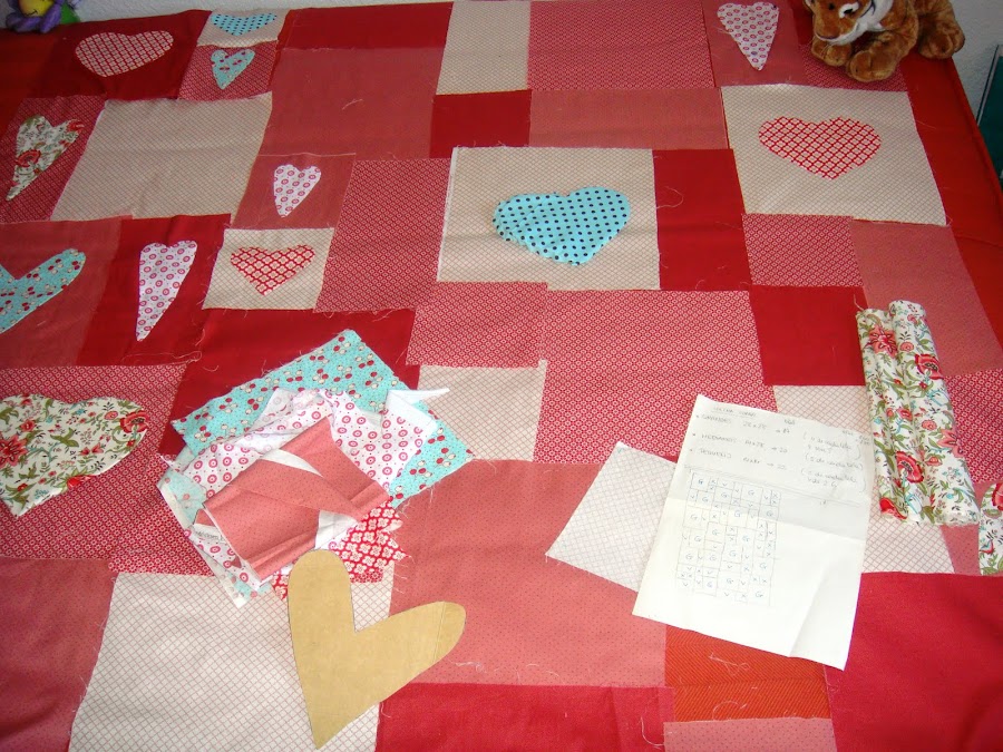 Lo mejor es el despliegue que monto cada vez que me pongo con la colcha...para elegir la tela del corazón me gusta hacerme una idea de cómo va a ir quedando el conjunto, así que empiezo a poner cuadrados con cuadrados...y para ver cómo queda la colcha completa hace falta bastante sitio...(el tamaño total creo que será 1,60 x 1,80 metros) Así que cada vez que me pongo comienza el despliegue...