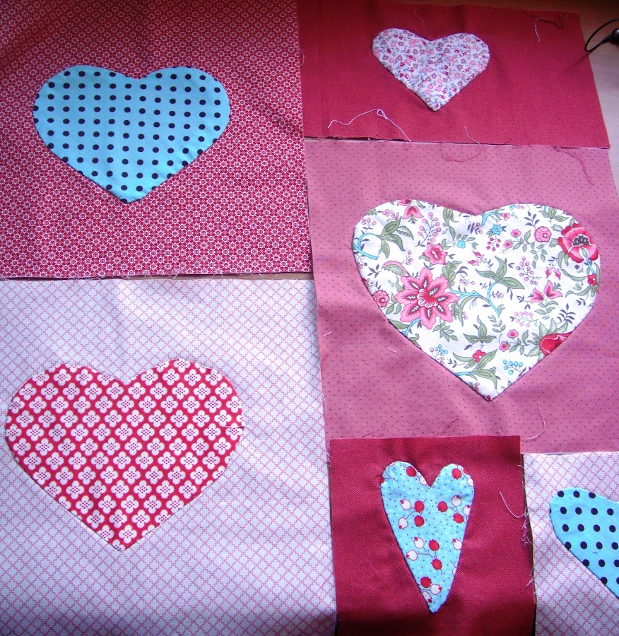 La colcha es de cuadrados y rectángulos de distintos tamaños y colores, cada uno de ellos lleva un corazón cosido como aplicación. Los corazones también son de distintas formas.
