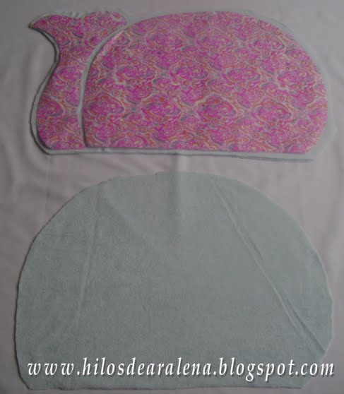 Cortamos para el cuerpo entero ( con cola incluida) 2 partes enfrentando los derechos y 1 sola del cuerpo sin cola, dejándole a éste último un poco más de margen para costura.