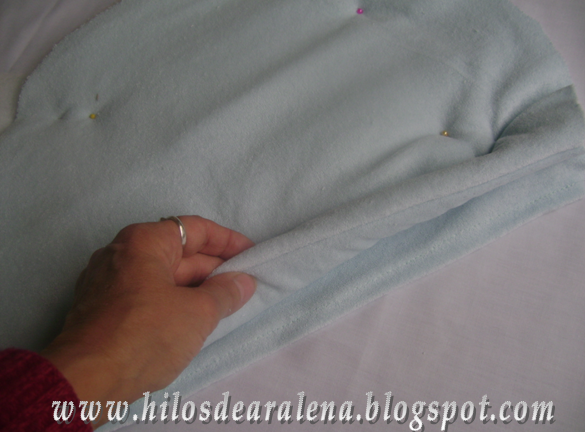 En la parte del cuerpo con cola que nos queda suelta, hacemos un dobladillo igual al anterior.(foto de la derecha)