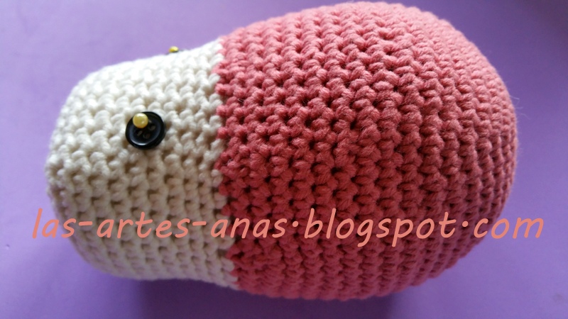 OJOS:YO HE COLOCADO 2 BOTONES NEGROS AL ALCANZAR LA VUELTA 26, separados por 7 puntos. Comenzamos a rellenar la cabeza.