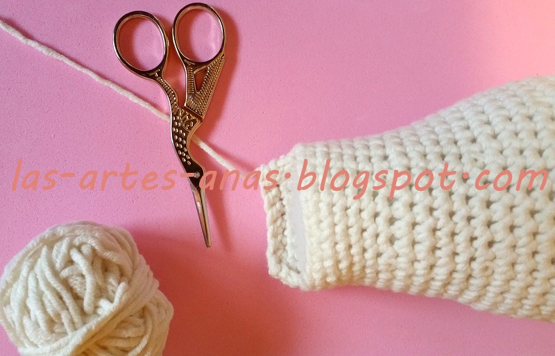 Rellenamos el brazo. Para cerrarlo juntamos la cara anterior y posterior y hacemos la vuelta 33 con 6 pb (cogiendo 1 cadena de delante y una de detrás, os pongo fotos a ver si queda más claro).