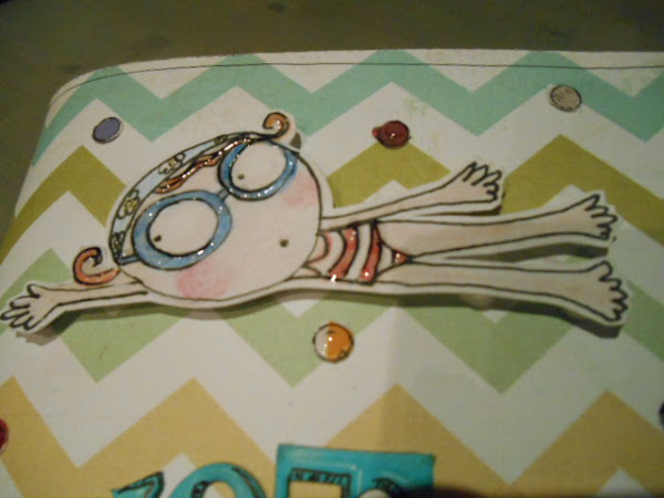 La portada me más pequeña que el interior, pero luego la he rehice en dos niveles (me ha ido bien así pues ha quedado como bolsillo al juntar las dos partes) el título aprovechando letras y moldes de 2 abecedarios y pintadas con tinta Distress Ink peacock feathers y glossy, y perfiladas con rotu negro y blanco; la nadadora en cuanto la vi me encantó, gracil y veraniega, con sus burbujitas con glossy accents, la tomé prestada de pinterest de la caja de pintura, creo que da un aire fresquito al mini!