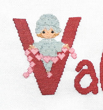 Vamos a ver los detalles de la muñeca, que lleva un camisón de dormir, con gorro a juego, en celeste con topitos. Y en sus manos lleva una guirnalda de corazones.