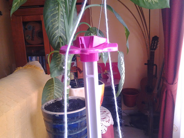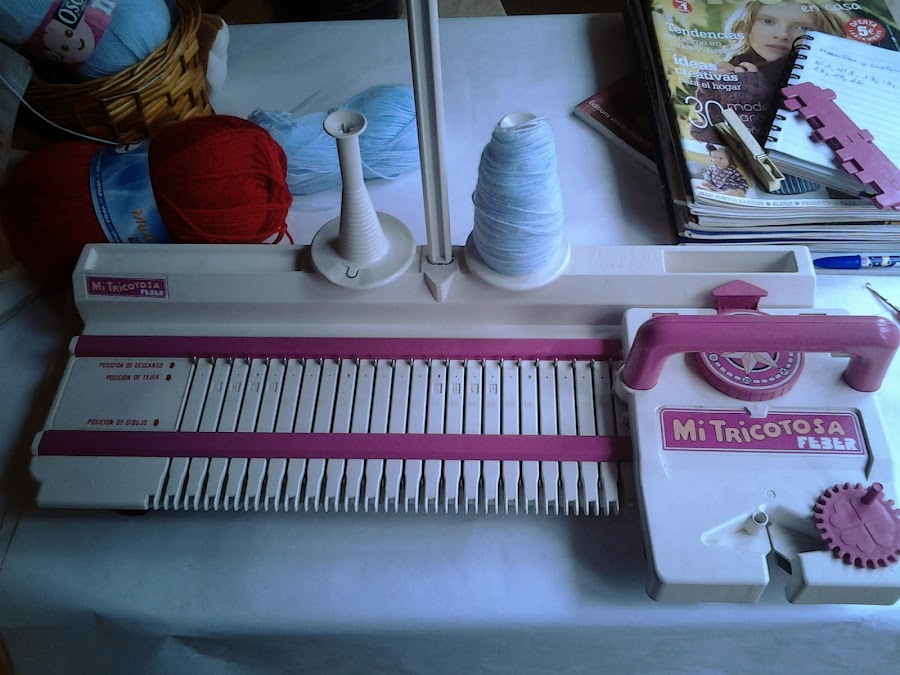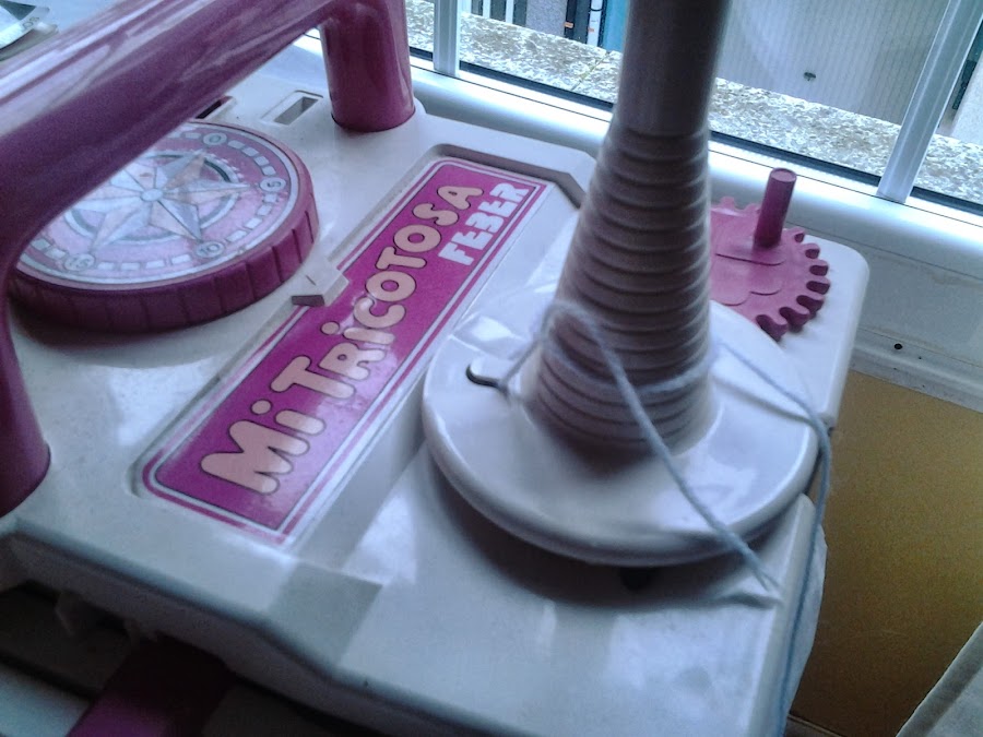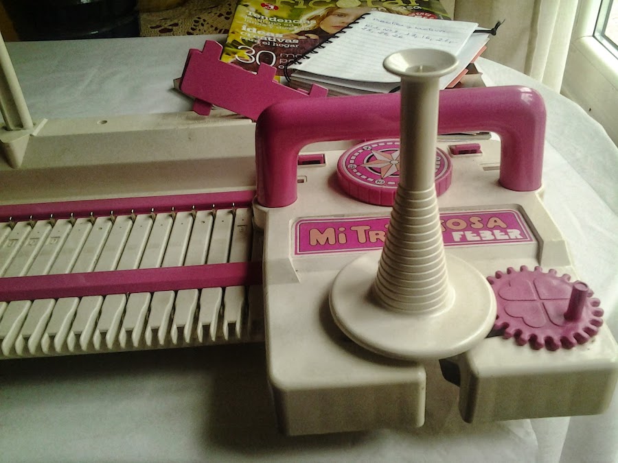 esta tricotosa la compre en ebay hace a un tiempo,yo he tenido una cuando era pequeña al verla en la subasta quise comprarla para que mi hija viera como eran nuestros juguetes, una tricotosa de juguete que trabaja como las de verdad,para mi fue un juguete muy especial con ella aprendi a calcetar,sé por los correos que me enviais que sois muchas las que os hiciste con una pero que no sabéis como funciona,su manejo no es dificil ya que estaba pensada para los niños pero os aseguro que es más completa que alguna tricotosa manual de las que ha ahora en el mercado,para empezar tenemos que hacer el cono de la lana