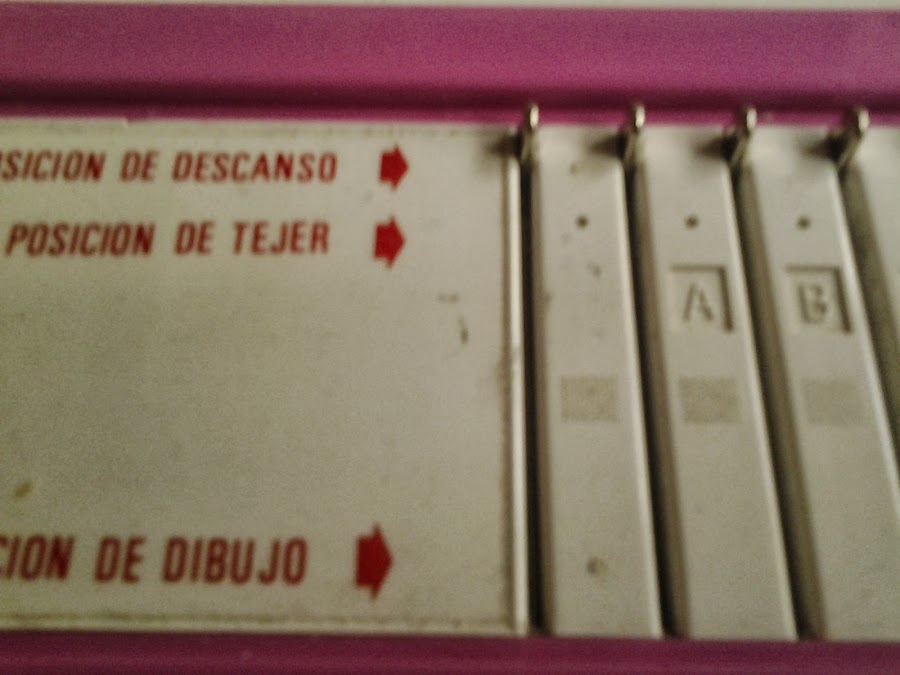 estas cositas rosas que son como peines sirven para colocar las aguja en la máquina, abajo tenemos otra herramienta que es como una aguja de la tricotosa con un manguito,esto sirve para hacer el elástico,pero esto a tiene que ser otra entrada...ahora de momento las que la tenéis ya podéis comenzar a tricotar con ella...lo demás poco a poco con mucha imaginación...recordaros que las agujas tienen varias posiciones en la tricotosa estan señaladas con letras