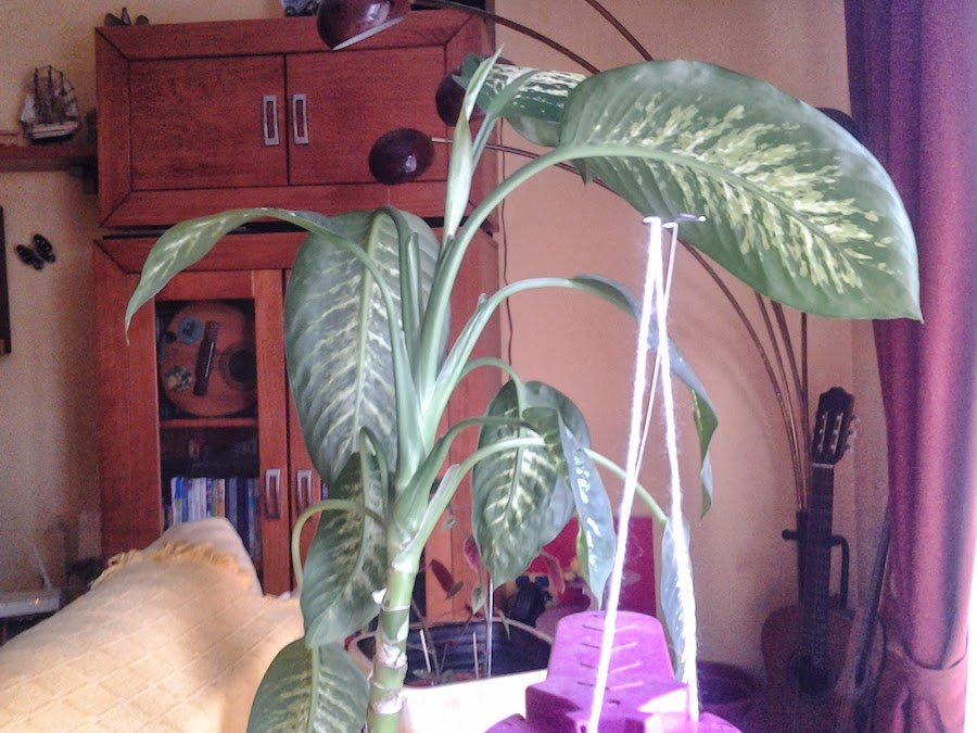 para enhebrar la máquina pasamos la lana por detrás la hacemos pasar por la guia rosa,despues la pasamos por el agujerito del alambre,por la guia pequeña de delante y por ultimo por el agujero y llevamos la lana hasta el carro