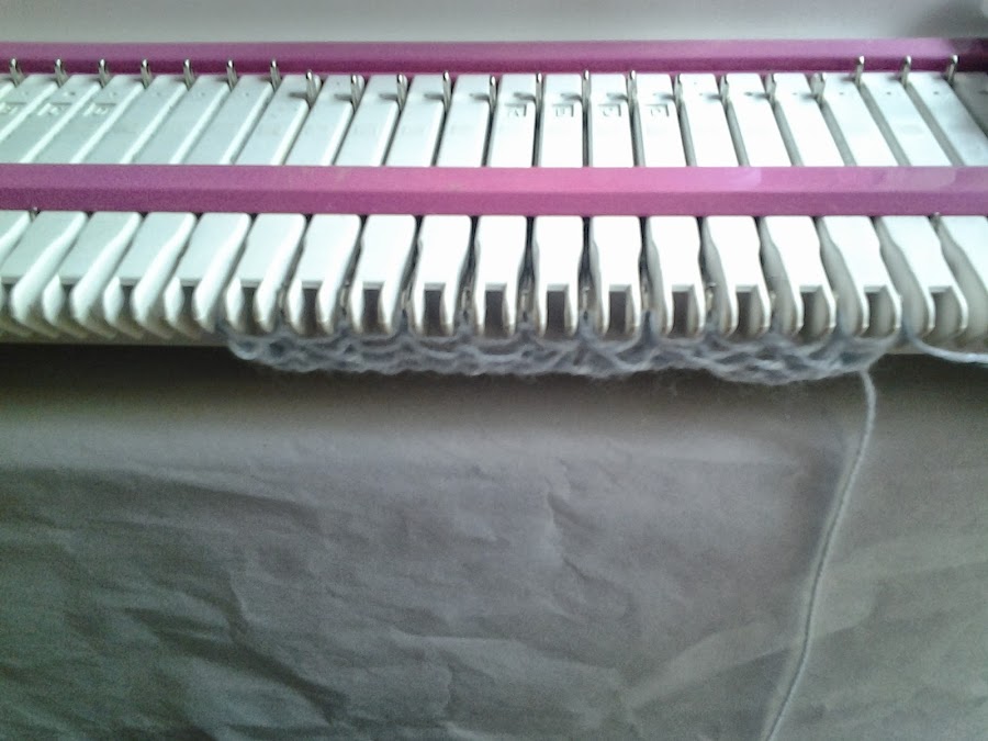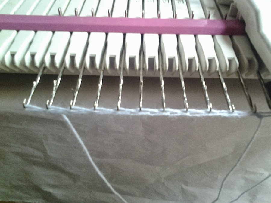 pasamos la lana por el agujero de la tricotosa a esta lista para calcetar