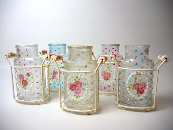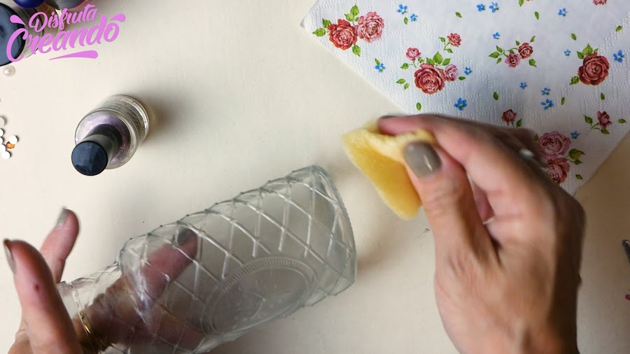 Así procedo con todos los frascos que ya previamente esmerilé con distintos esmaltes, pero la servilleta de decoupage que uso es siempre la misma, lo que va a ir variando es el esmerilado.
