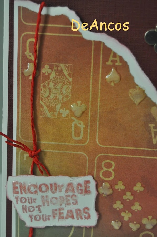 He utilizado un papel decorado de cartas de juego, que recorté a mano de forma desigual, pegado sobre una cartulina blanca para diferenciarlo bien de la cartulina texturizada efecto tela de color vino que puse debajo.