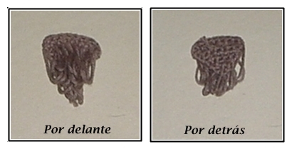 Vuelta 6.- Sin hacer la cadeneta de subida, saltamos un punto y hacemos (4 p bucle)