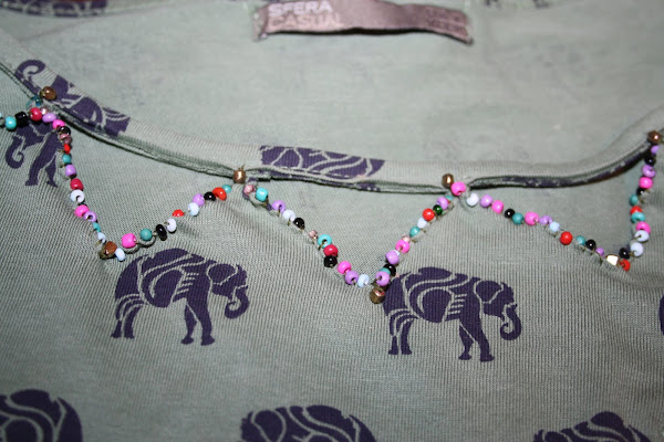 A continuación, cosemos todo el borde de los cortes y añadiremos abalorios por el mismo. De esta forma aseguraremos que no se nos deshagan los triángulos porque les daremos unas puntadas extra a la vez que decoramos con los abalorios.