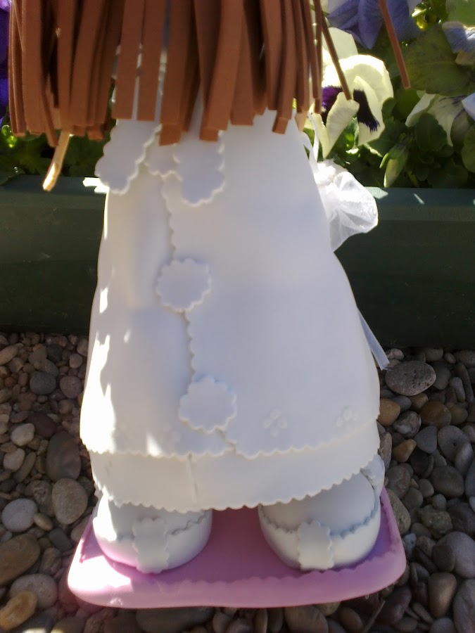Os presento el último trabajo realizado, una fofucha de comunión que se ha ido para Canarias. Esta niña quiso hacer la comunión de corto y con bailarinas. Como podéis ver el vestido es con falda doble y con el cuerpo bordado. Lleva un lazo en la cintura y en el pelo, a juego con la falda. El peinado es trenzado y con abalorios. Lleva a su vez una cadena con un angelito, una pulsera dorada y un ro ...