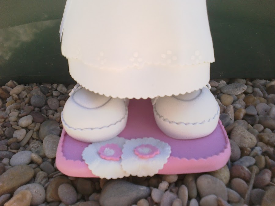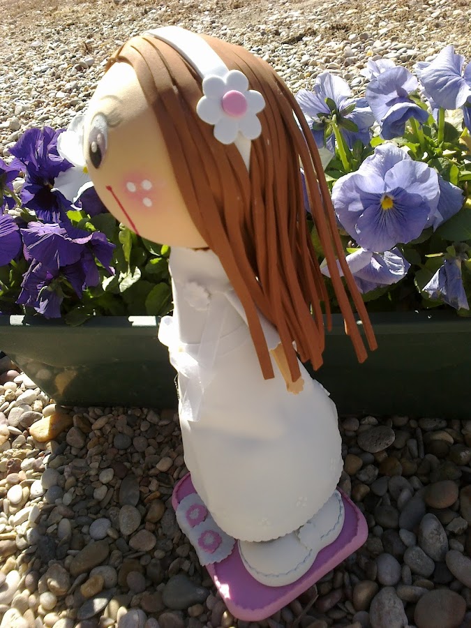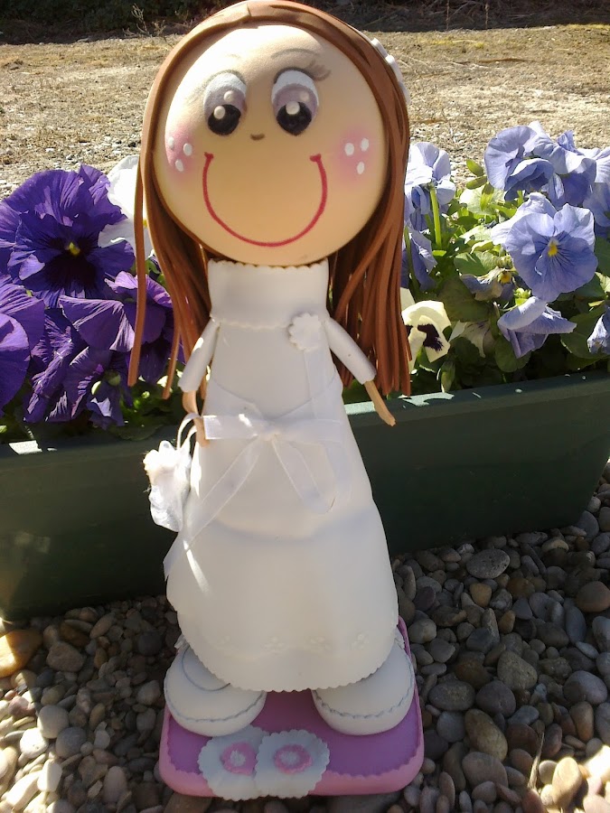 Estas son algunas fotos de la fofucha Silvia vestida de comunión. Hicimos 35 como regalo para cada pareja de invitados. Son de nuestras primeras fofuchas. En las fotos no se aprecia, pero lleva el cuerpo del vestido grabado a relieve. Hemos visto fofuchas de comunión que llevan los vestidos hechos de tela. Nosotros decidimos hacerlo todo de goma eva, incluidos los adornos, pensamos que se vería má ...