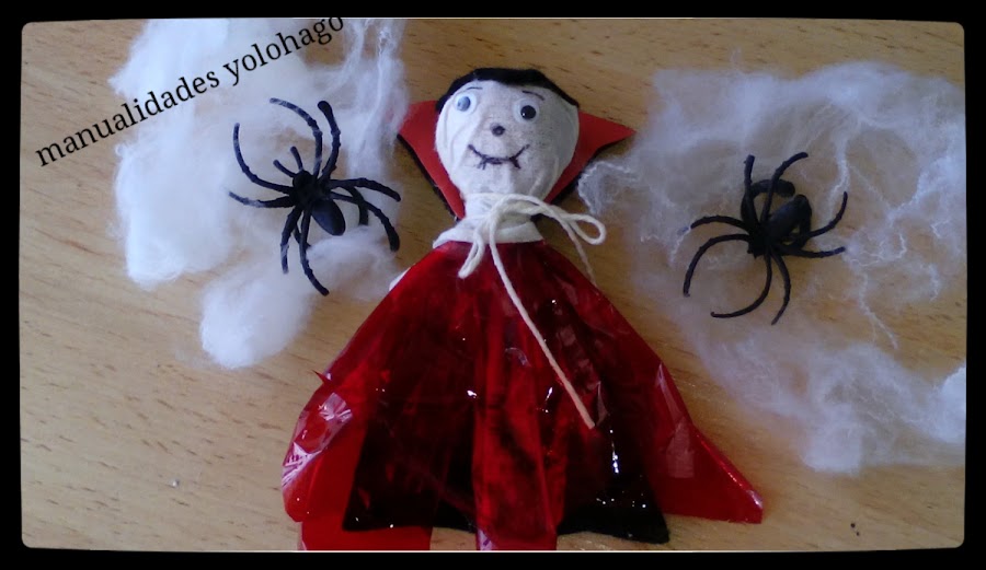 Pega los ojos, dibuja la boca y ata la capa con el cordón. Ya tenemos listo el vampiro para nuestros niños.