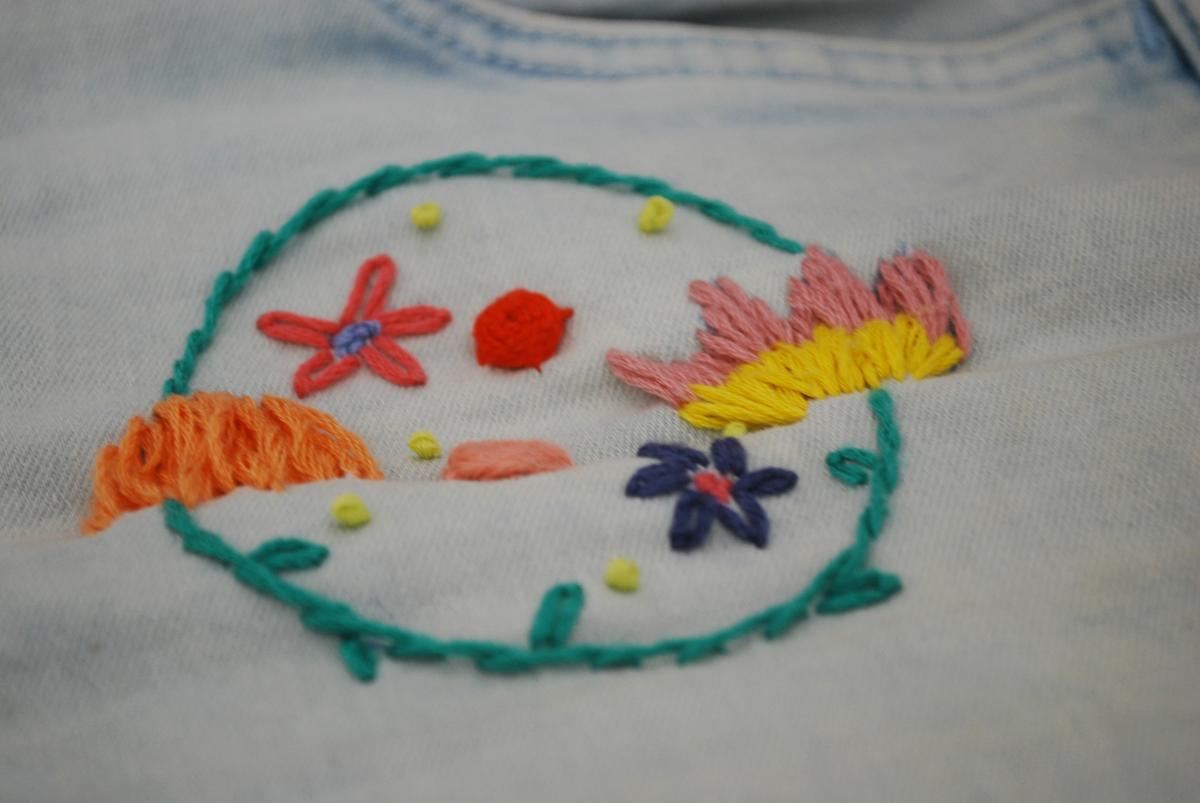 Para el otro lado del vaquero, improvisé un poco con diferentes tipos de flores y punto, no usé ningún patrón especifico, simplemente hice el circulo para delimitar donde quería que hubiera flores y después fui bordando tal como me venía.
