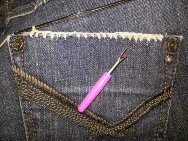 Una vez que hice los rotos que me gustaron pasé a adornar un poco los bolsillos, es aquí donde entra el crochet.