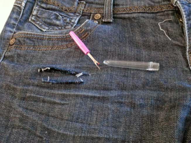 Os aconsejo que saqueros algunos hilos blancos en el corte del pantalón y que dejéis algunos más colgando para disimular un poco el corte.