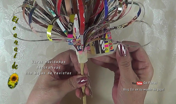 Hojas gruesas de revistas, cola blanca, tijeras o cutter (o trituradora de papel si tenemos), tijeras, papel crepe verde o floratel para los tallos, palitos gruesos de madera si tenemos, barniz y glitter(opcional) y cinta para carrocero.