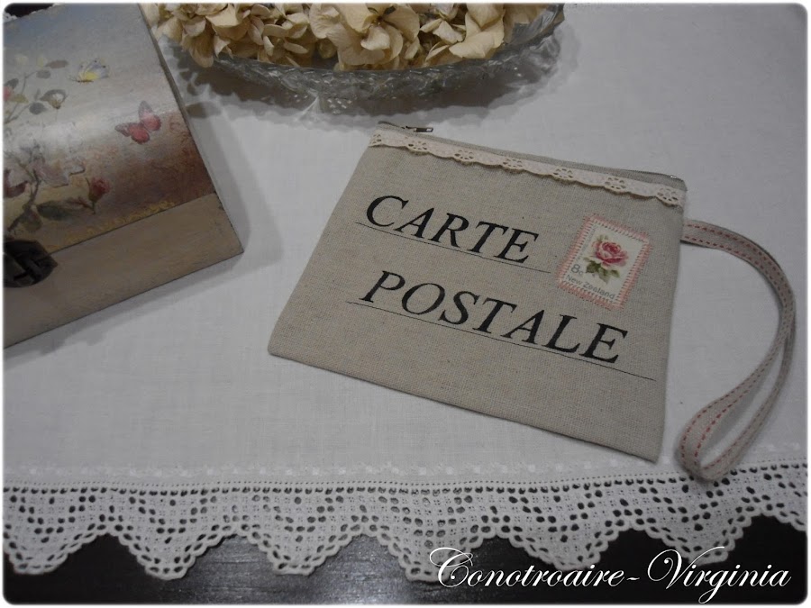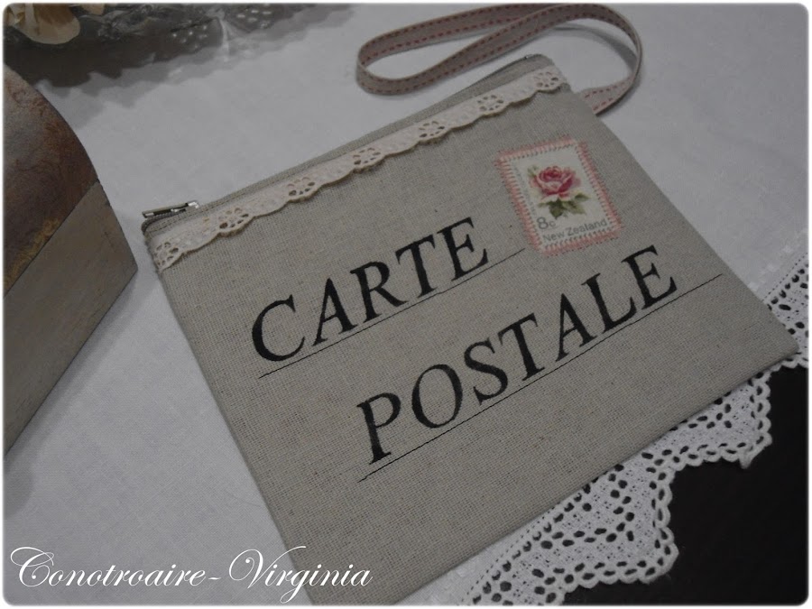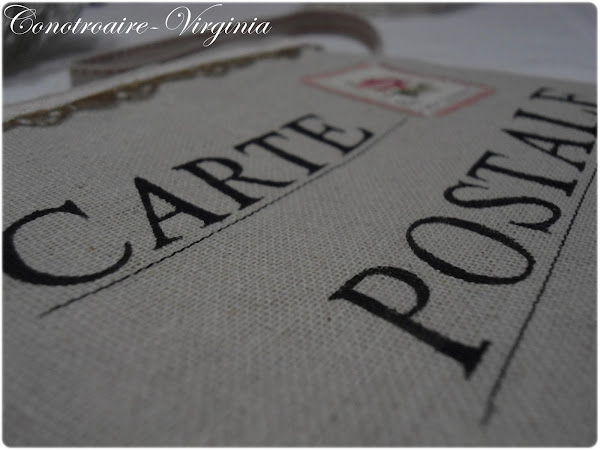 Las letras las he pintado con un stencil que hice yo misma, y luego a mano alzada pinte las uniones. Luego debajo les hice un pespunte sencillo con la maquina de coser para imitar las lineas de las postales.