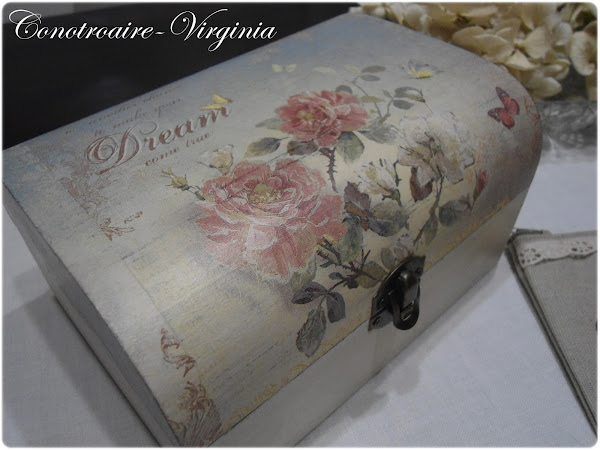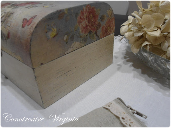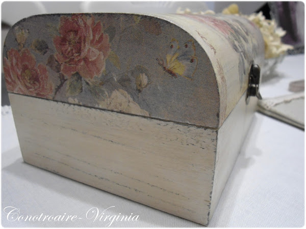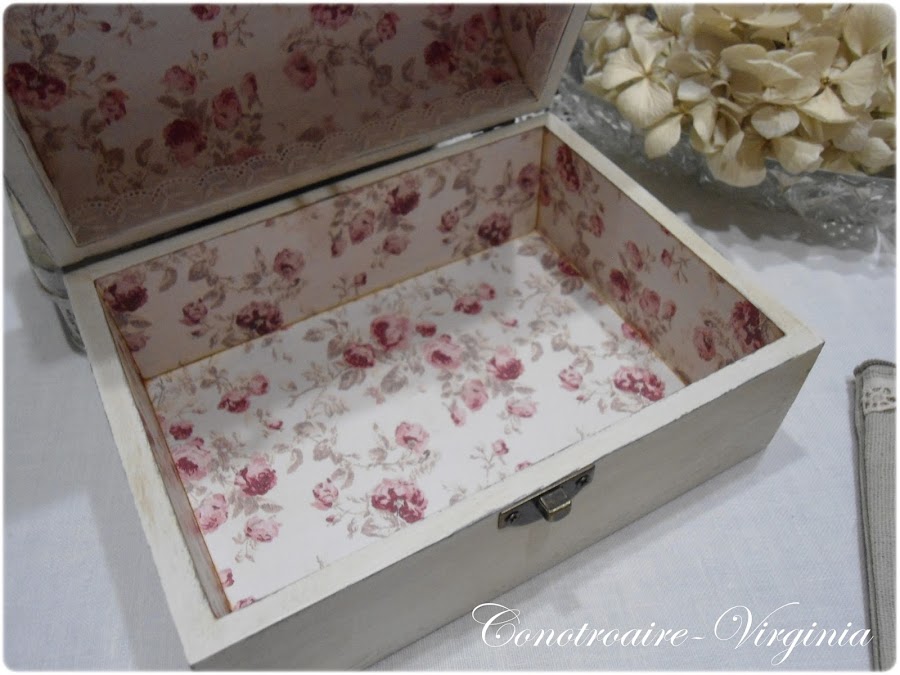 La caja, la pinte de marrn chocolate y luego color blanco roto. Lijadita para sacar el color de abajo, eso en toda la caja, y al poner la servilleta, deja ver las vetas, y le da un aspecto mas envejecido a la servi.