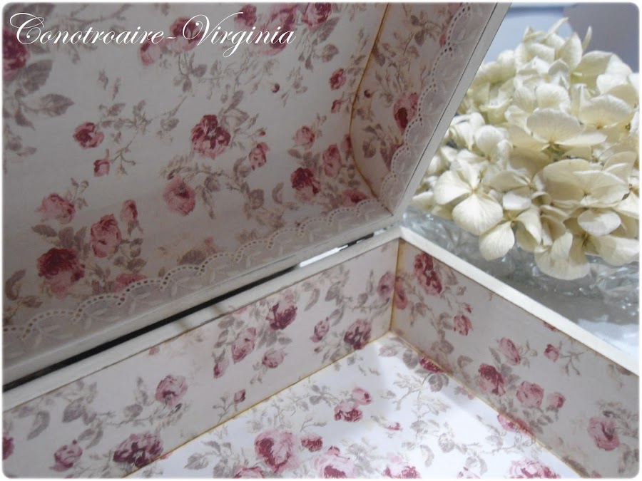 El interior lo forre con papel, es un motivo floral que imprimí en cartulinas finitas, corte las piezas y envejecí todos los bordes con tinta distress Antique linen, y como remate una puntilla por todo el borde.