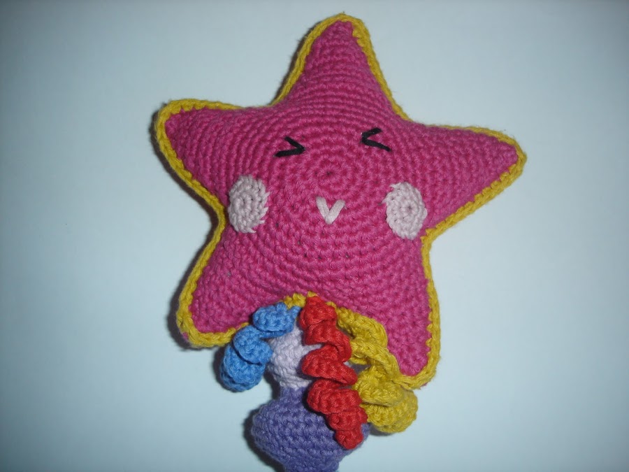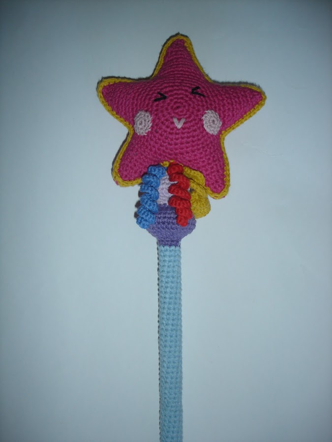 Hola de nuevo!!!!!!!!! Entre cosilla y cosilla de Navidad os traigo un proyecto que os encantará y a las niñas de la casa más aún: una varita mágica; y además el patrón es gratuito de Monkey Craft; lo encontré de casualidad mirando en Pinterest y lo guardé para cuando tuviera ocasión y como a mi hija le encanta Ben y Holly, pues que mejor excusa. Es muy fácil y de lo más resultona; yo de palo usé también uno de las jaulas de los pájaros, que es muy barato y funciona genial, eso sí, introducirlo lo más posible para que la estrella no baile, que ya sabéis como son los niños. Bueno, pues como siempre os dejo el enlace al blog donde podréis encontrar el patrón y espero que hagáis muchas varitas y me podéis enviar fotos, como no. http://monkeycraftspain.blogspot.com.es/2015/04/kit-princesa-amigurumi-la-varita-magica.html?spref=pi