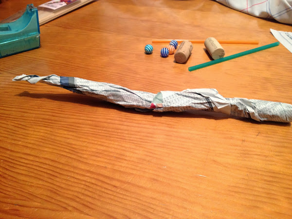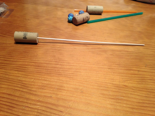 Pincha la varita de brocheta en un tapón de corcho, retuerce papel de periódico mojado en cola blanca o en engrudo, dale forma para que quede imitando madera.