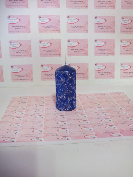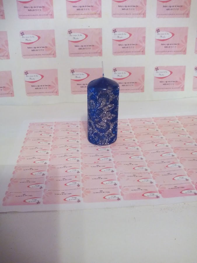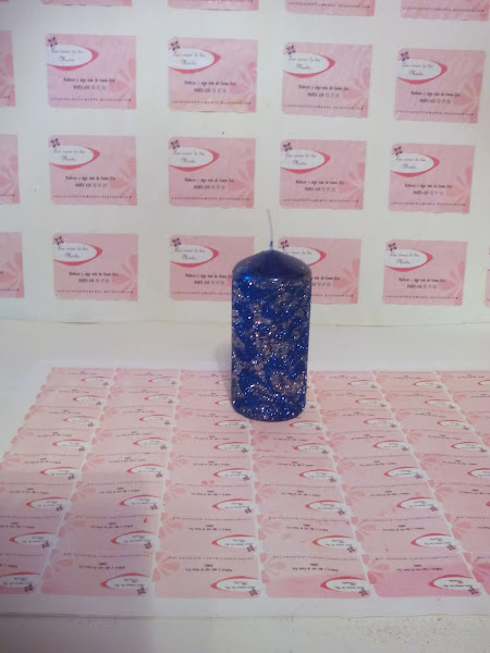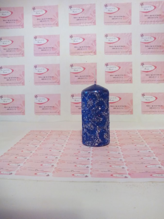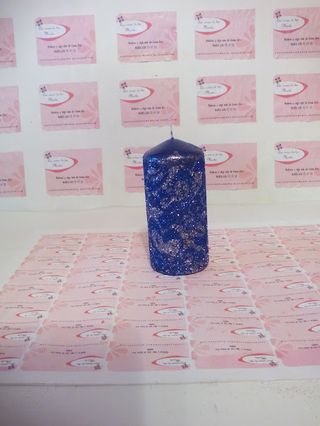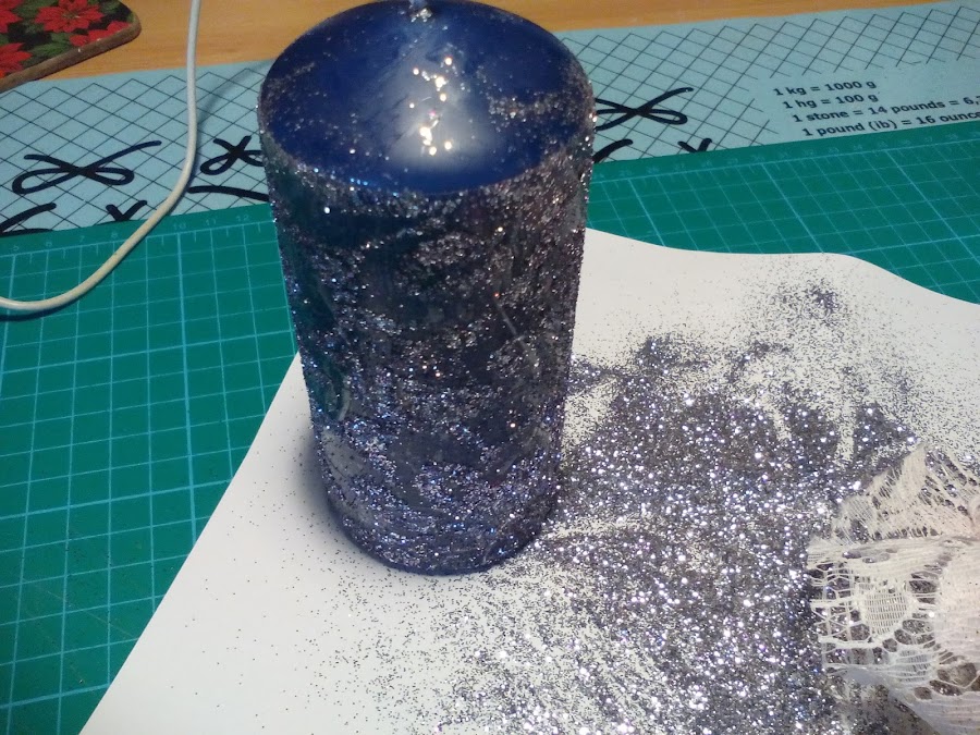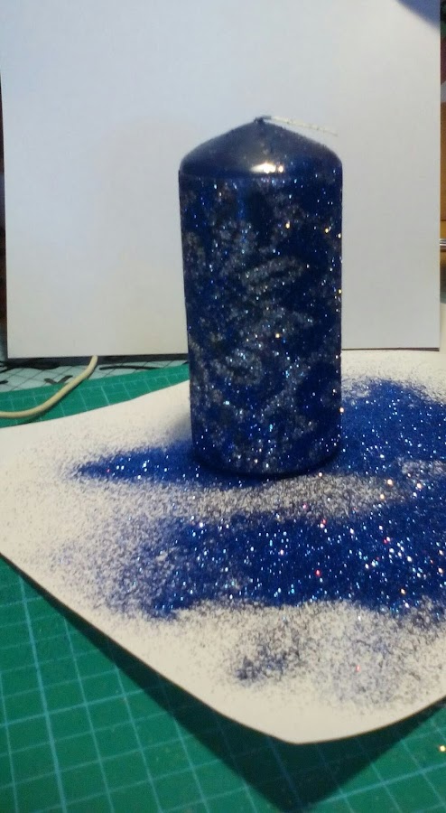 6. Cubrimos la vela con purpurina del otro color.