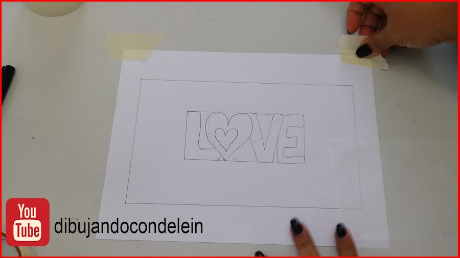 En mi dibujo yo coloque una palabra como centro focal, así que en mi hoja tamaño carta marque un recuadro para ubicar la palabra y que quedara centrada en mi diseño, luego dibuje mi palabra en la hoja para luego calquearla en el papel de seda, eso es lo único que voy a dibujar en la hoja porque el resto lo voy a hacer directamente en el papel de seda