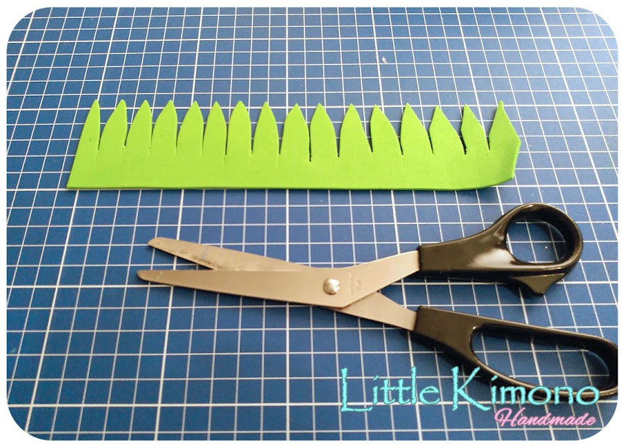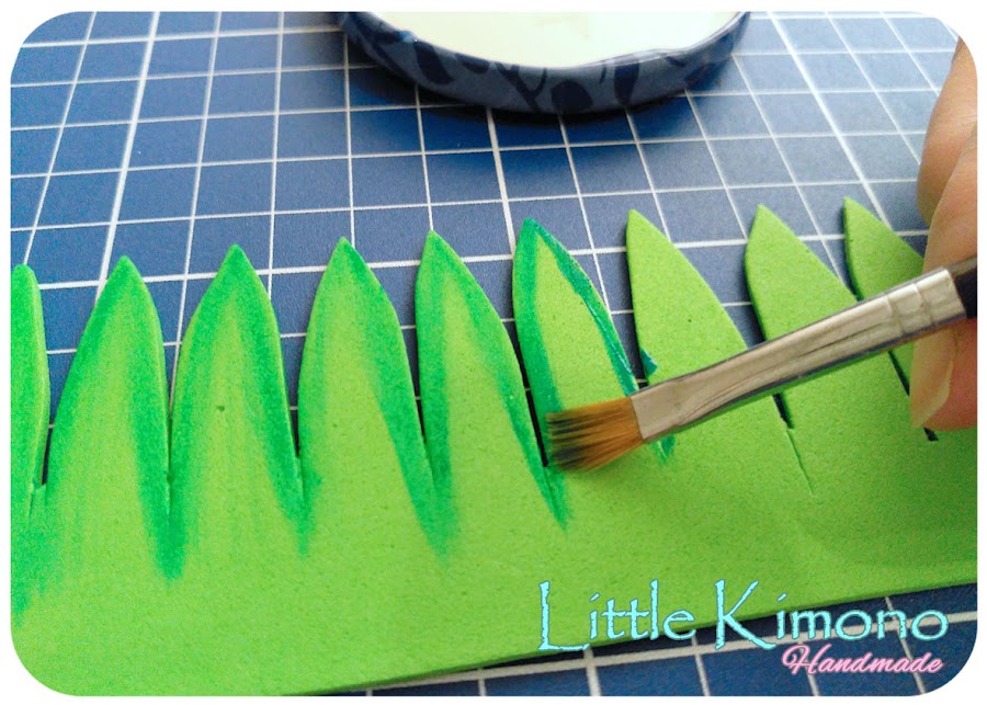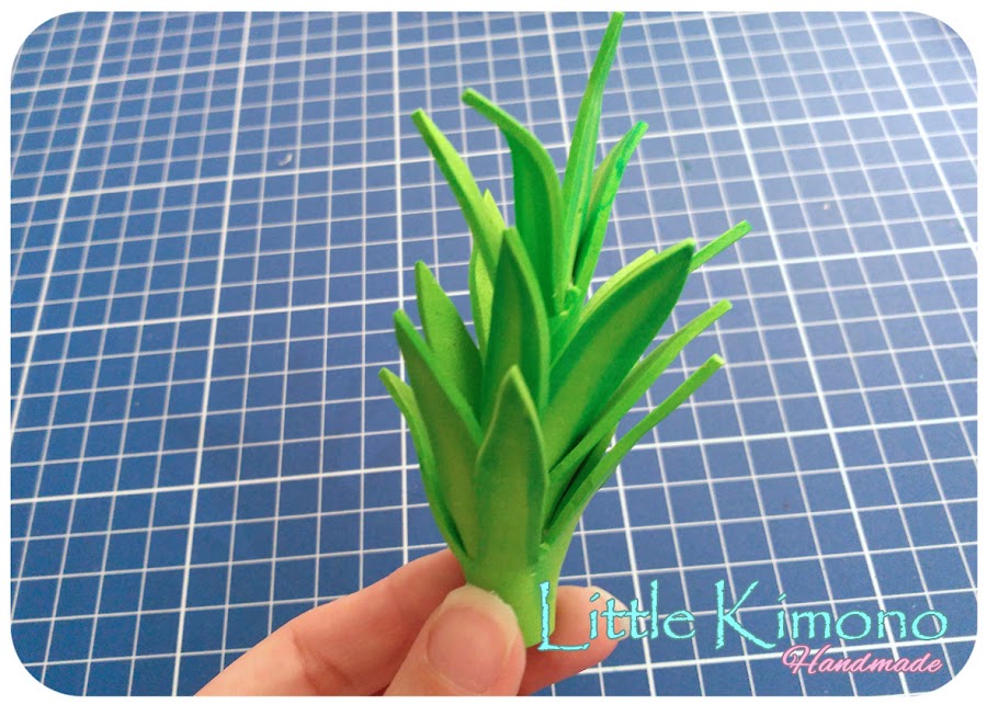 5. Igualmente mientras se seca la tapa vamos a hacer las hojas de la piña con goma EVA, cortamos una tira con la forma de las hojas como muestra la foto y con lápices acuarelables vamos pintando los bordes para darle una especie de sombreado.