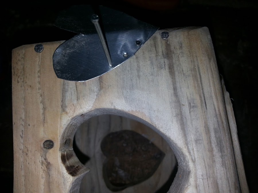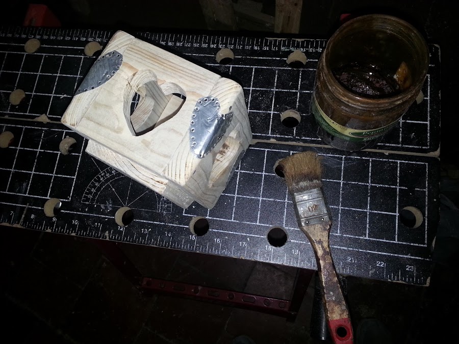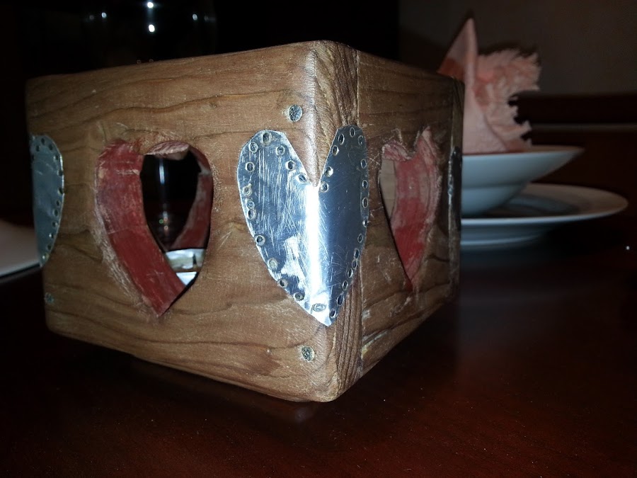 Los corazones de chapa los quiero poner en las esquinas de la vela, por ello lo presento y con una punta inicio los agujeros en los que luego pondré los mini clavos.