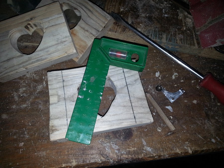 En un principio todas la madera era del mismo tamaño, por lo que dibujo a modo de plantilla, con la primera madera a la que hice el vaciado del corazón. Así me garantizo que todos los corazones me quedarán en el mismo sitio.