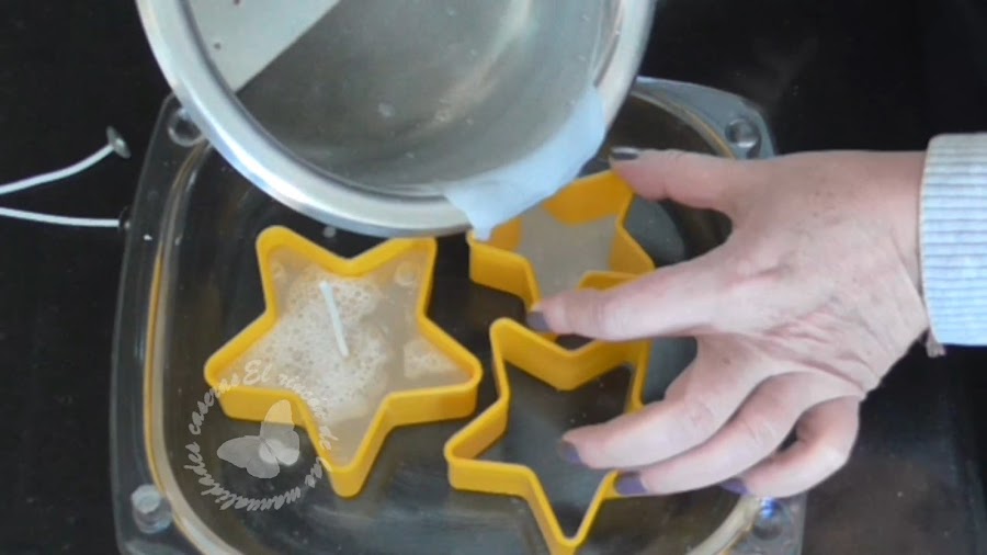 Otra manera de poner la mecha es una vez tenemos el molde con la parafina la dejaremos enfriar durante una media hora y con cuidado desmoldaremos, interesa que esté aún un poco caliente para poder con algo con punta y finito hacerle un agujero por donde luego pasaremos la mecha.