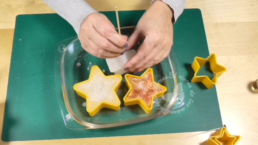 Y ya las dejaremos enfriar por completo, desmoldaremos y cortaremos el sobrante de la mecha, podéis decorarlas como más os guste, yo he probado con purpurina mientras estaban aún calientes y quedan muy bonitas.