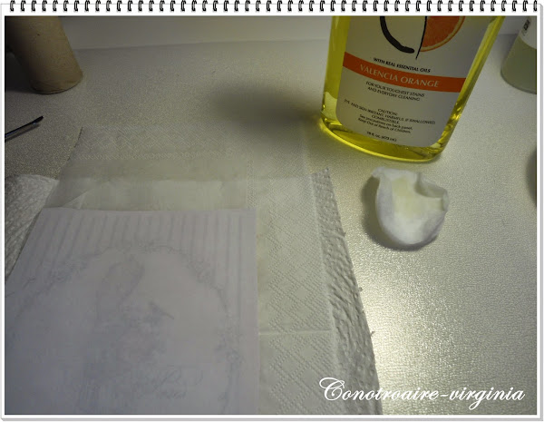 Imprimi la imagen en modo espejo, y coloque la imagen sobre el tissue, (yo utilice una de las capas blancas de las servilletas), y debajo puse papel de cocina.