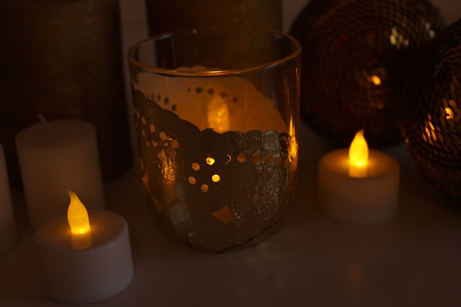 * Coloca la blonda con pegamento sobre el vaso, de forma irregular, más cerca del borde en uno de los lados para que se vea más bonita.