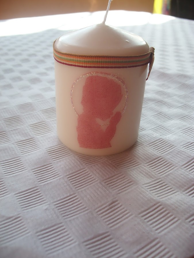 Y llegó el bautizo de mi niña Laura. En esta ocasión quería hacer algo diferente, no la típica figurita que todo el mundo echa para un rincón y se llena de polvo,pensé que una vela todo el mundo le da uso tarde o temprano.Y la verdad parece que acertamos porque a la gente le gustó muchísimo el detalle.