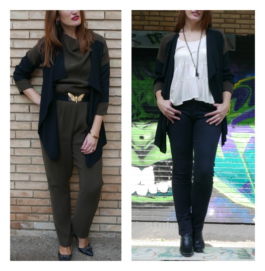 Aquí podéis ver dos looks diferentes, con la misma chaqueta, en primer lugar la chaqueta que combina con el mono, ya que parte de las mangas son de la misma tela que éste, y en plan más informal con vaquero negro y camiseta.