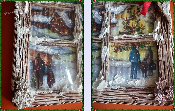 Es una Ventana Navideña que he realizado reciclando cartón, decoupage con servilleta , relieves de pasta de modelar y como cristales he utilizado una hoja de acetato.
