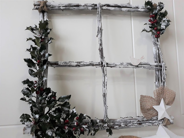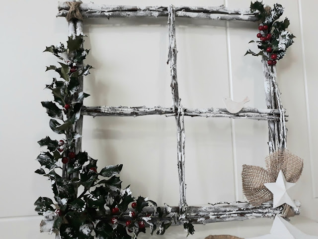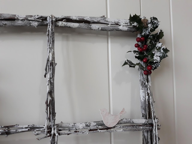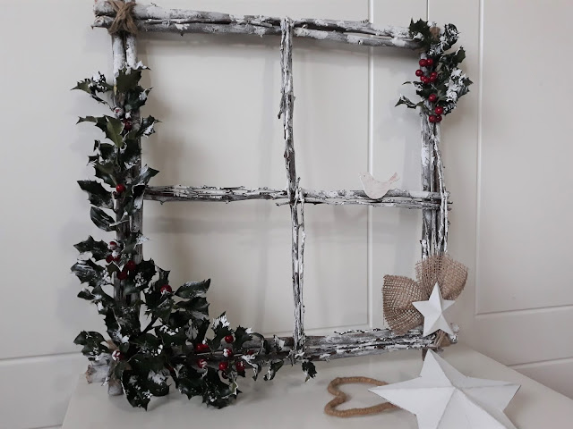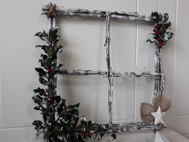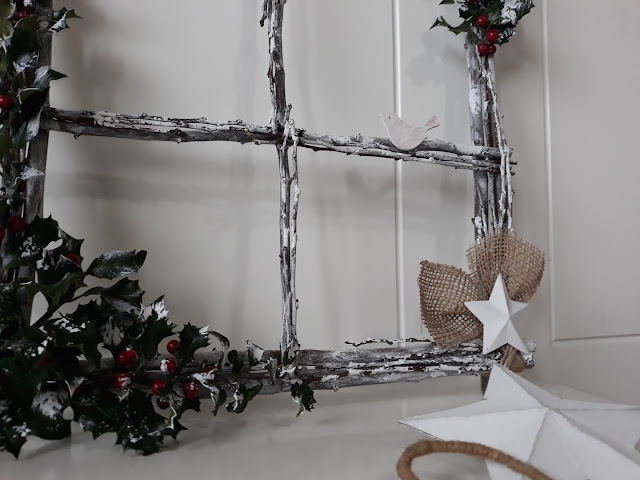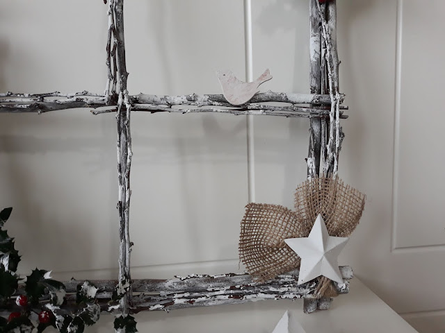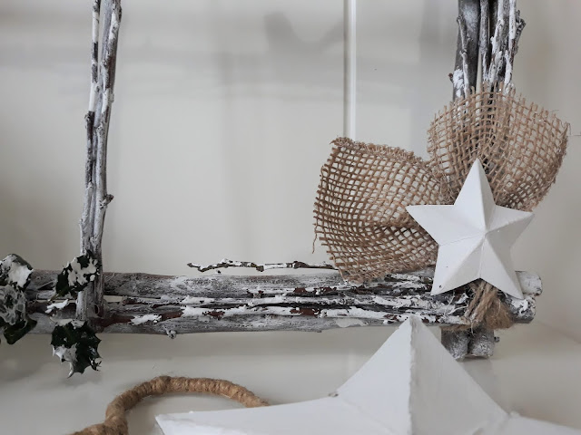 Está hecha con ramas, acebo, arpillera y una estrella hecha con cartón. Y lleva un pajarito de madera que me había mandado Anna por ser la ganadora de uno de sus lotes.