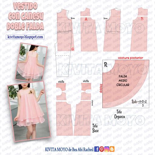 La característica mas sobresaliente de este modelo es su doble capa de falda que se traza con el mismo concepto de una falda medio circular.