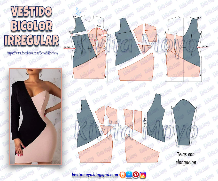 Trazar el patrón básico de vestido a medida, y luego transformarlo desplegado ya que se trata de una prenda irregular. Se descontaran 2 cm en laterales y 0,7 cm en sisa y hombro.